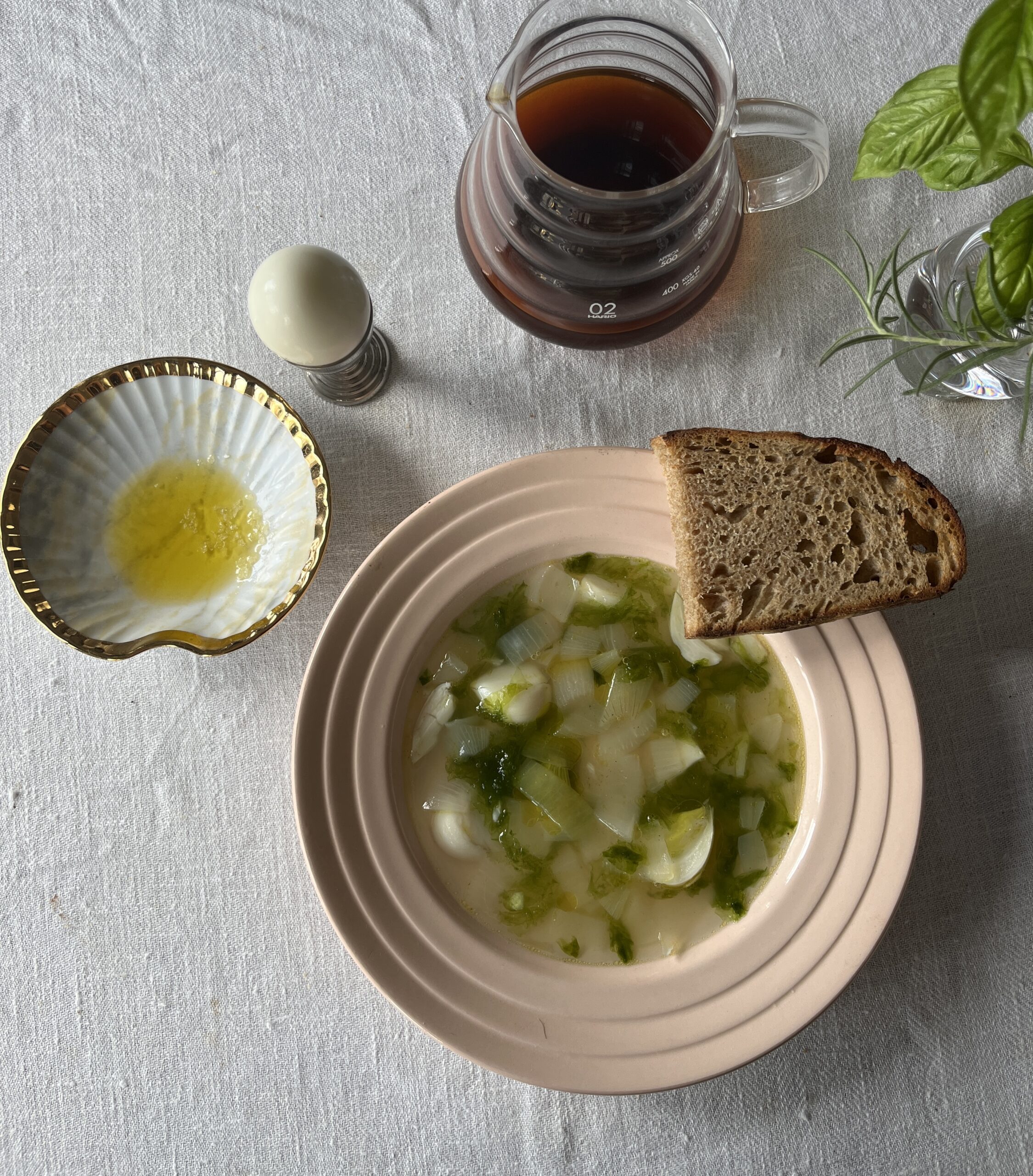 パンを購入した日は伊勢旅行からの帰りだったので、その日を思い出しつつ、伊勢のあおさのりのスープ(玉ねぎとニンニク)といただきました。添えているオイルは1のコンフィのオイルに結晶塩をぱらりとしたものです。